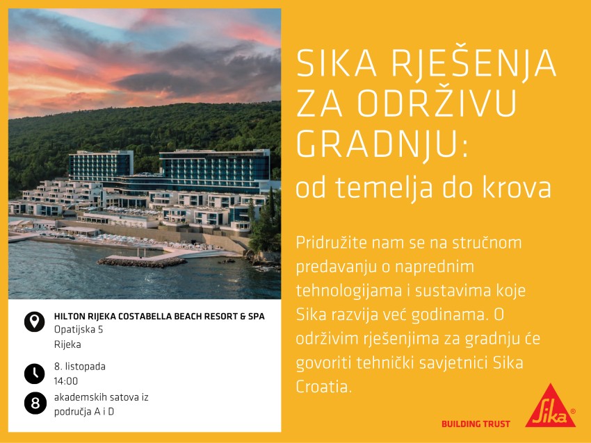 Pozivamo vas na stručno predavanje posvećeno naprednim tehnologijama i sustavima koje Sika razvija s ciljem promicanja održive gradnje. Naši tehnički savjetnici podijelit će s vama dugogodišnja iskustva i predstaviti inovativna rješenja - od temelja do krova - koja doprinose dugotrajnosti, održivosti, sigurnosti i učinkovitosti objekata.